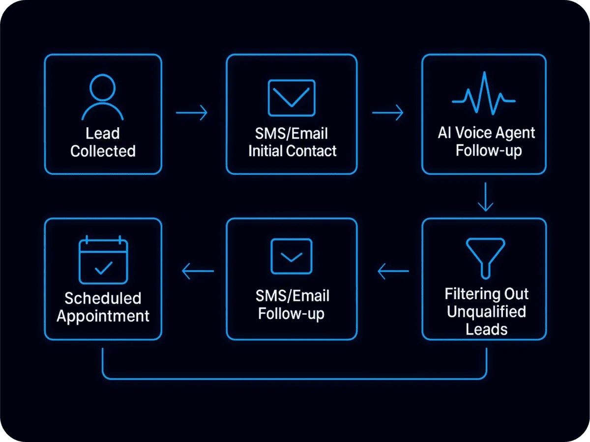 From the moment a lead comes in, our system goes to work: filtering out the unqualified, following up with AI, and booking real appointments straight to your calendar — all without you lifting a finger.