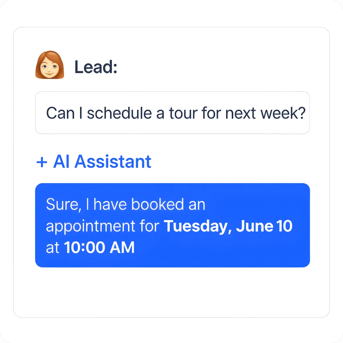 Plug AI into your sales pipeline — from lead capture to booking, with seamless CRM integration and 24/7 follow-up via SMS, email, and voice.