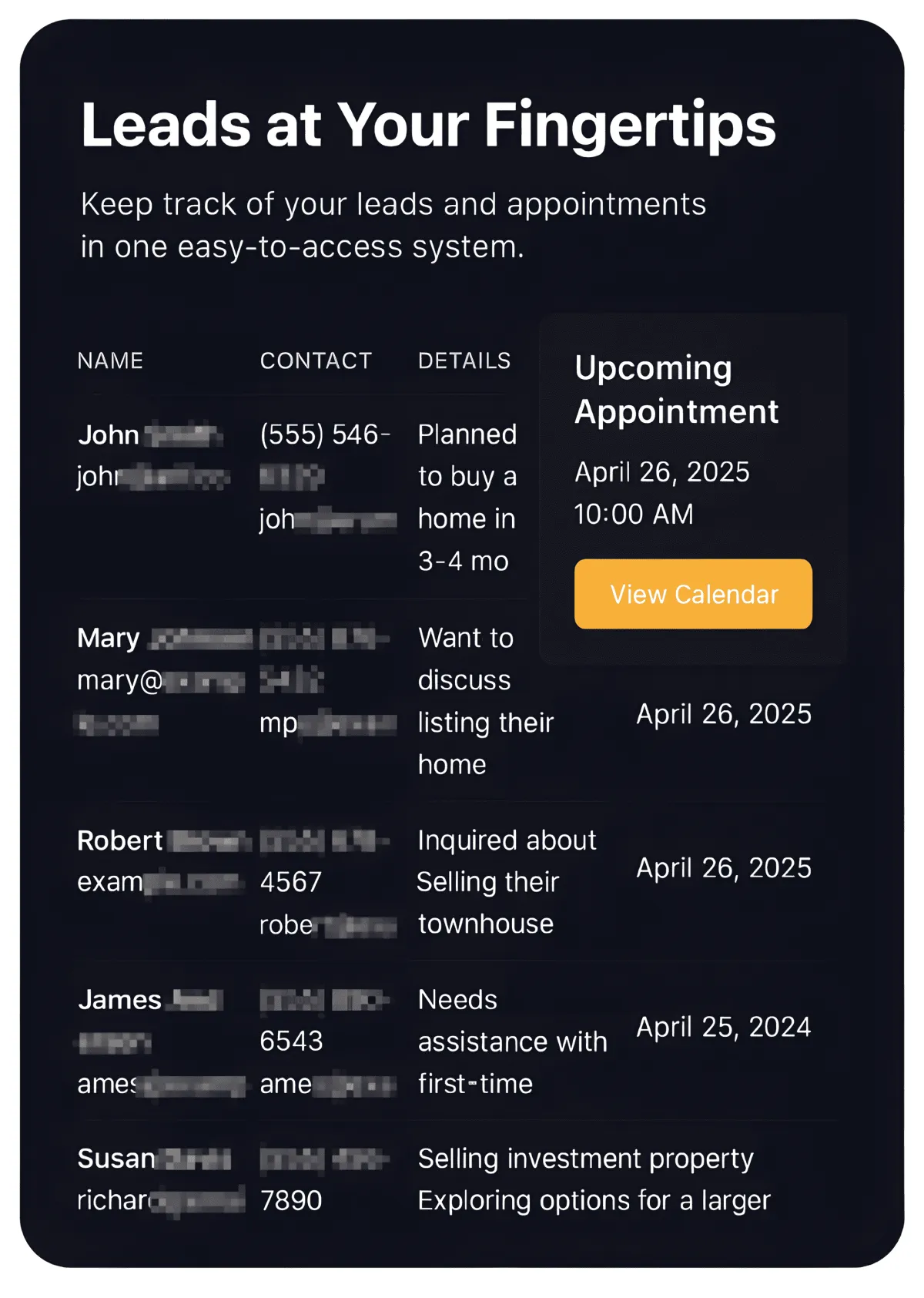 Track every new lead, review conversation summaries, and see all upcoming appointments — all in one easy-to-use dashboard that syncs with your calendar.